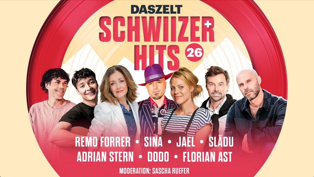Um 19:30 Uhr beginnt die Show „Schwiizer Hits 2026“. Auf der Bühne stehen bekannte Namen wie Florian Ast, Adrian Stern, Remo Forrer, Dodo, Sina und Slädu.